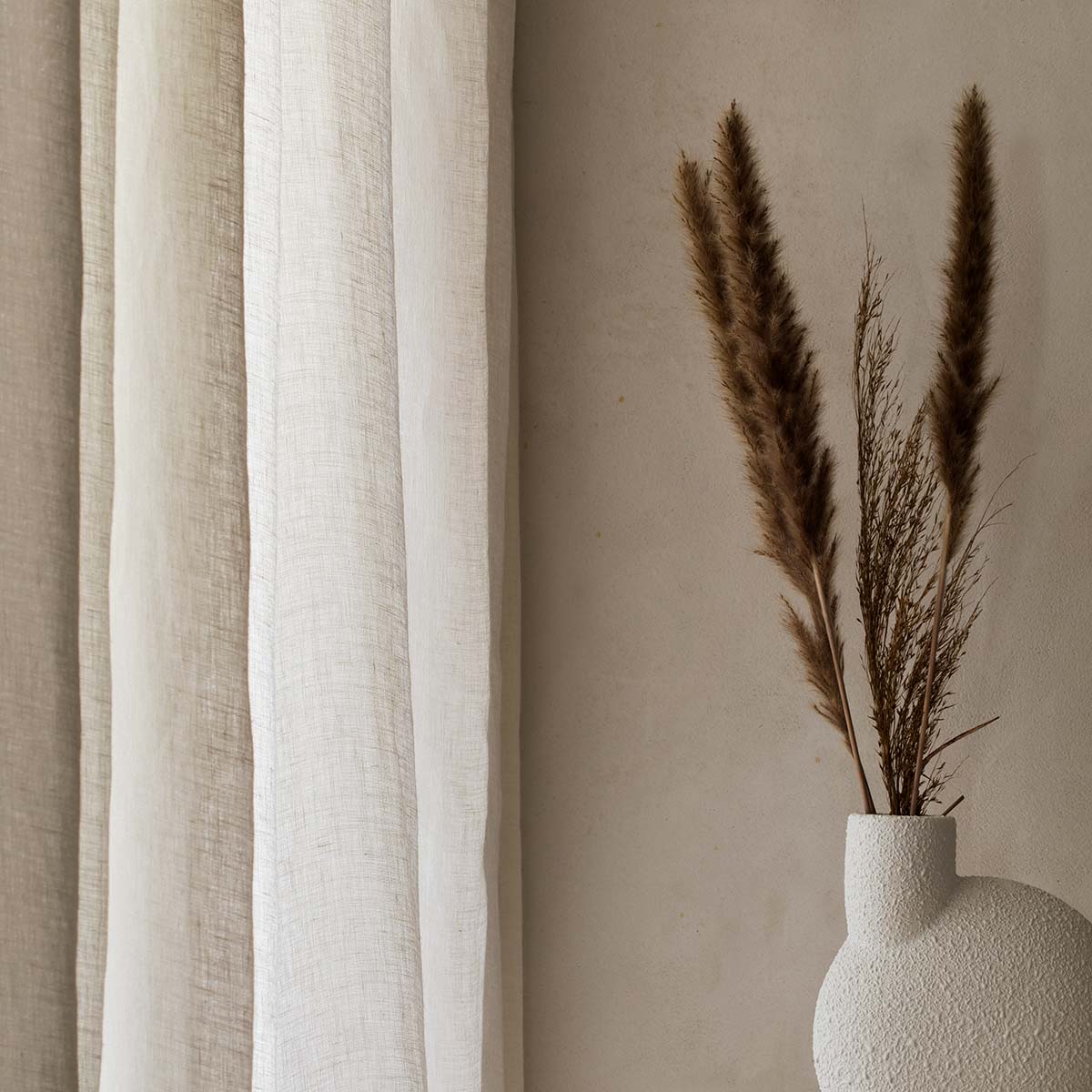La textura jaspeada en lino 100% hace de Moss un tejido natural y versátil. Su ligereza invita al paso de la luz a través de distintos matices blancos, linos, taupes o grises.